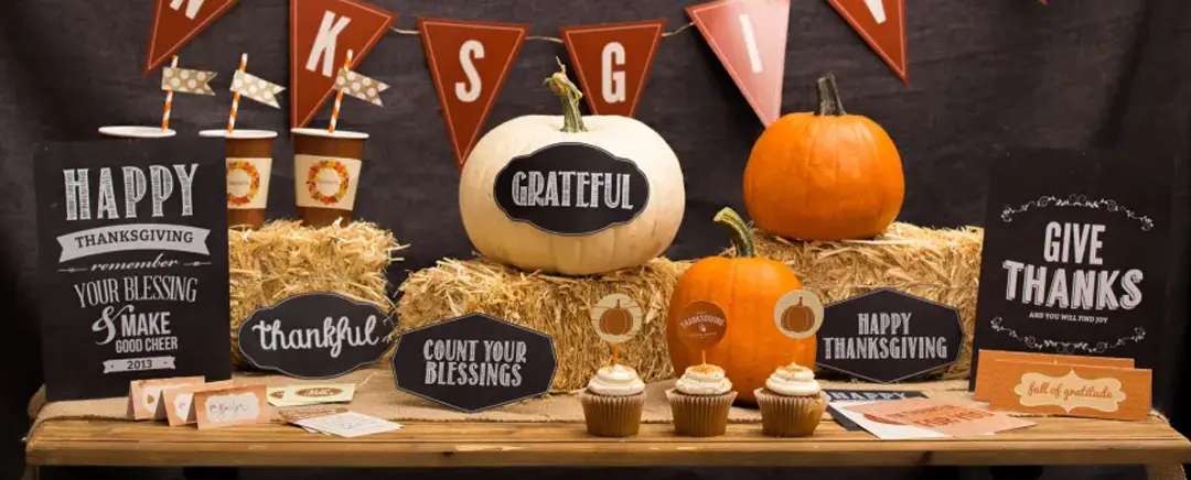 Popular Thanksgiving party themes include “Harvest Celebration”,”Vintage Farmhouse Gathering” and “ Friendsgiving Feast”.