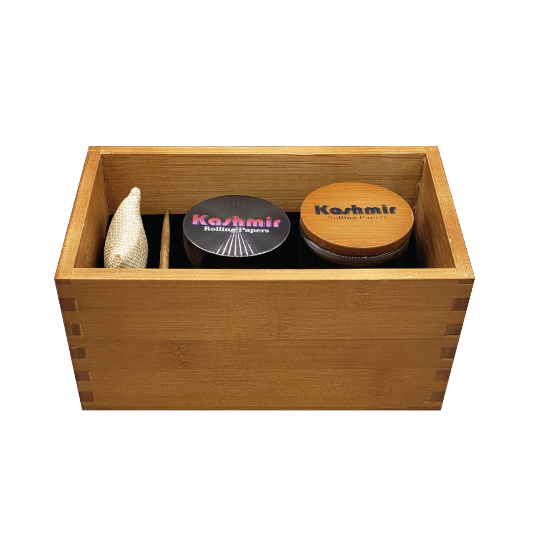 Inside, precision foam inserts lock down the essentials: your Kashmir logo grinder, a mini wood rolling tray, a clear storage jar, a packing stick, and the included deodorizing bag. Each piece has a defined spot, so you can grab, roll, and put it back without hunting around. When you close the box, everything stays still and quiet—no rattles, no mess.