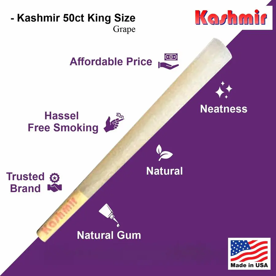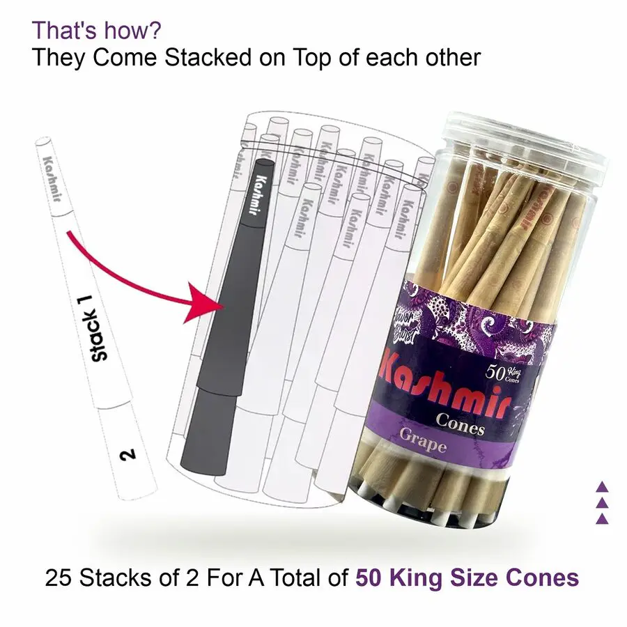 Kashmir Pre-Rolled Flavored King Cones are the perfect solution for those seeking a high-quality smoking experience with a natural touch. Each pack of Kashmir Pre-Rolled Grape Flavored King Cones: 50CT  includes 50 pre-rolled cones, made from organic hemp papers that are unbleached, chlorine-free, and GMO-free. The organic hemp papers used to make these King cones are said to offer a smoother and more natural taste than traditional papers. One of the main benefits of using pre-rolled cones is that they offer a simple and convenient way to enjoy your smoking experience without having to worry about rolling your own joints. The Kashmir Flavored King Cones have a pre-rolled design which makes them incredibly easy to use; all you need to do is fill them with your chosen smoking product, twist the end to keep it in place, light it up, and enjoy.
