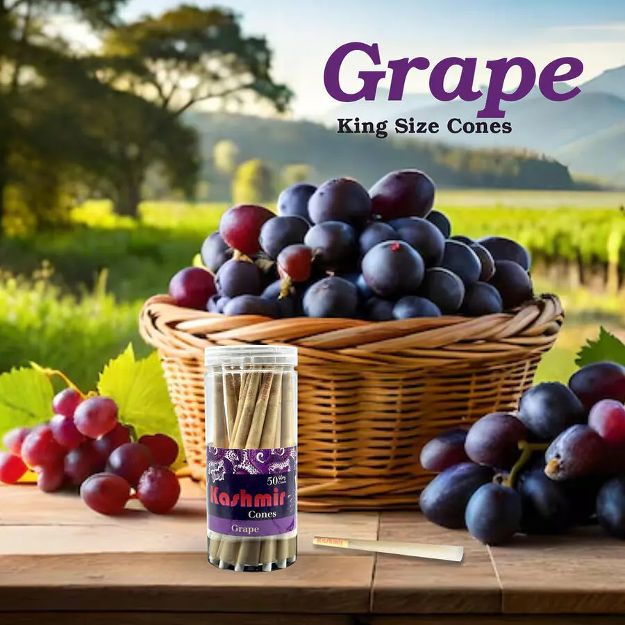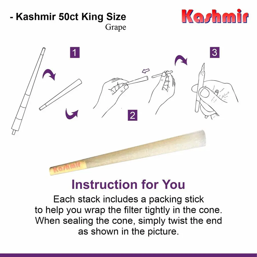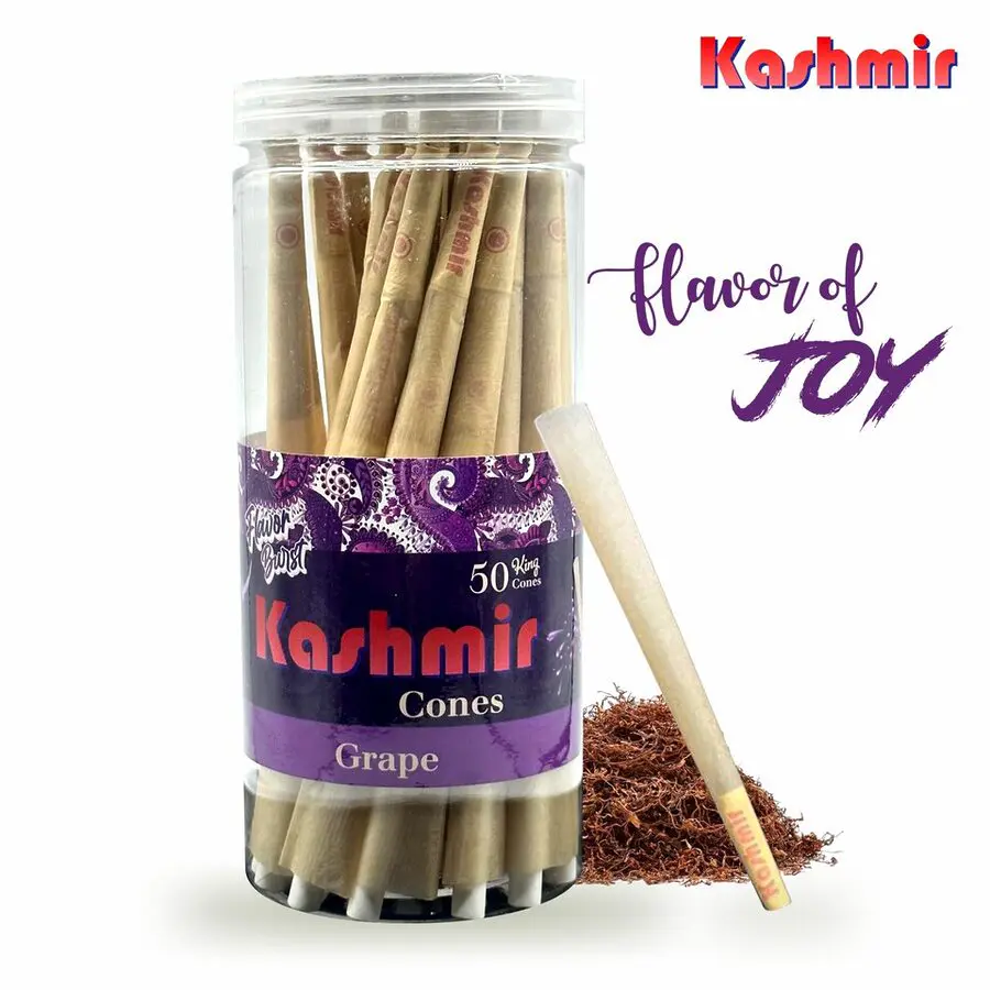 Kashmir Pre-Rolled Grape Flavored King Cones: 50CT Cones start with the same high quality Kashmir Flavored Rolling Papers along with a Kashmir paper tip and natural gum adhesive for the ultimate in consistency and smoking satisfaction you’ve come to expect.  Kashmir Flavored King Cones are made from natural flavor , ensuring a more natural taste, and embossing for an even burn.  Kashmir Pre-Rolled Grape Flavored King Cones: 50CT Cones won’t be here long, so catch yours while you can!