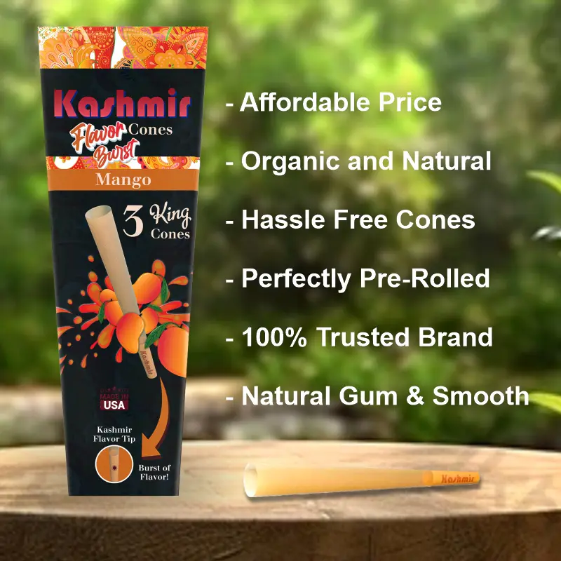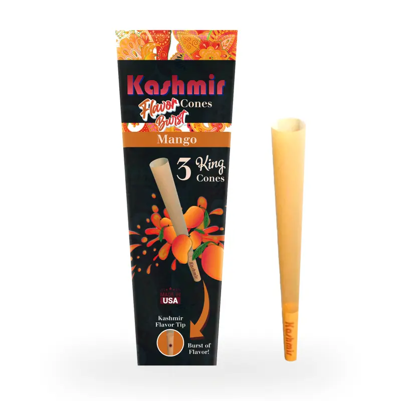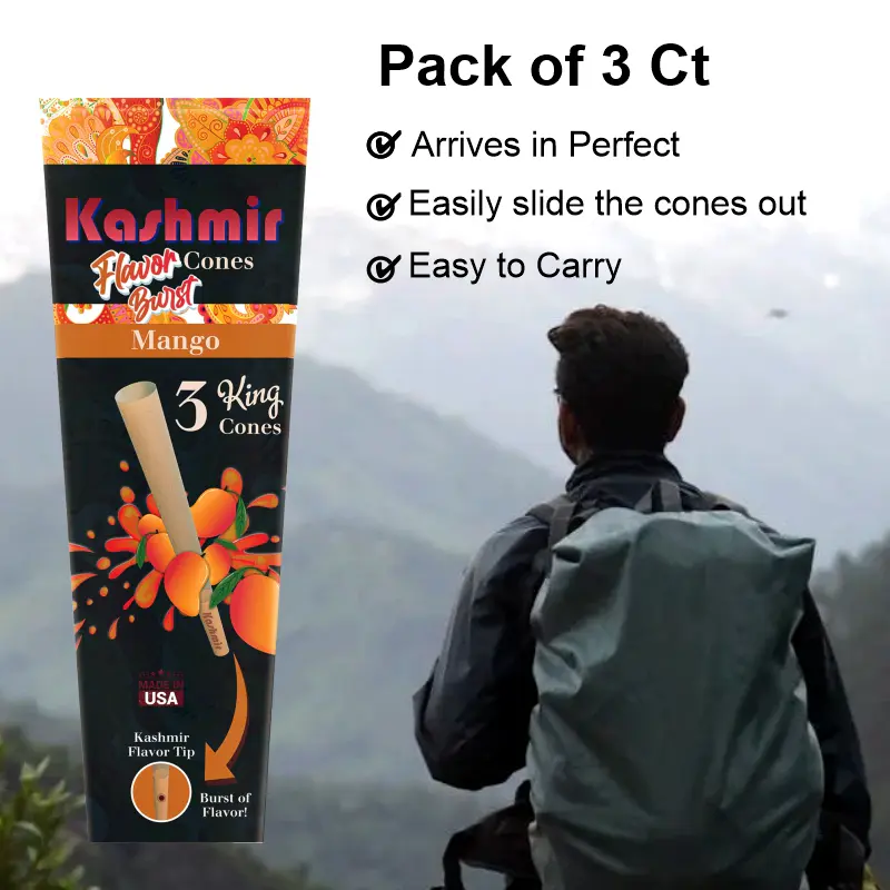 The Kashmir Pre-Rolled Mango Flavored King Cones: 3CT also come with paper filters that make them even more enjoyable to use. The filters help to reduce tar and other harmful substances when you inhale, ensuring a smoother and less harsh smoking experience. The filters also help to keep your smoking product from getting in your mouth while you enjoy it, making it a more enjoyable and cleaner experience overall. One thing that sets Kashmir Flavored King Cones apart from other pre-rolled cones on the market is their size. These King cones are much larger than standard pre-rolled cones, which means you can put more smoking product in them and enjoy a longer and more satisfying smoking experience. This makes them ideal for sharing with friends or for those who prefer a larger roll.