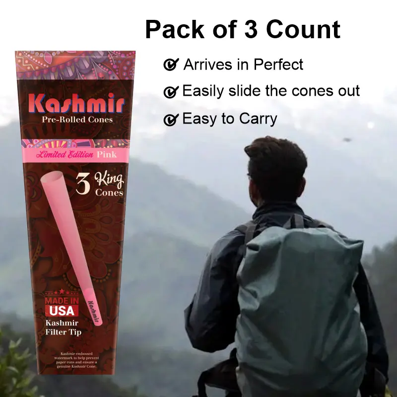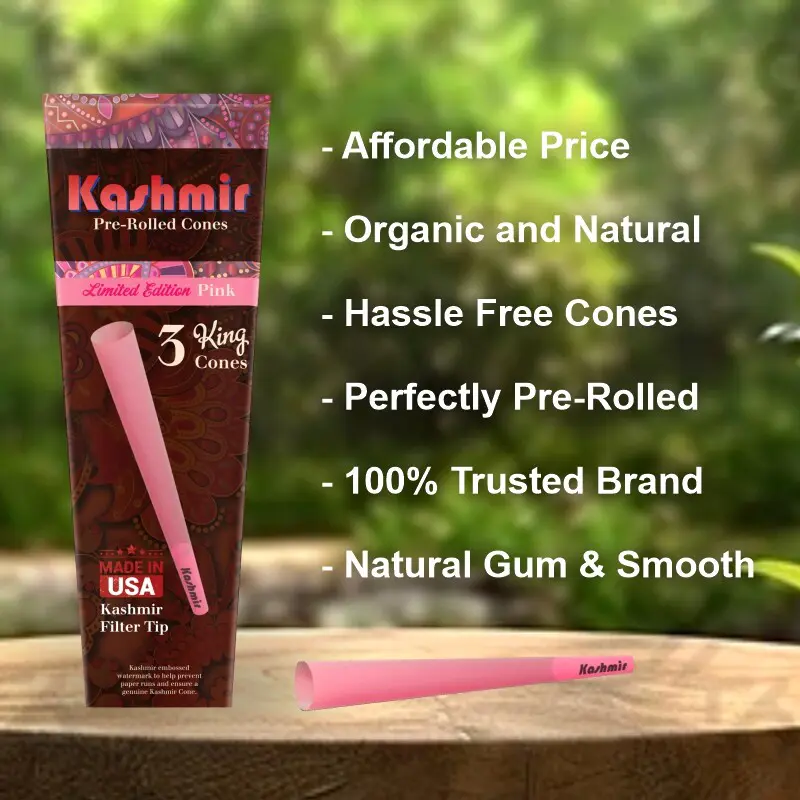 Elegently smoke pretty Pink Pre Rolled Cones with a flirtatious twist. Our Kashmir pink king size cones made with the same high quality rolling papers along with a kashmir paper tip and natural gum adhesive for the elegant dazzling affair. Kashmir Pink Cones are crafted in the USA from premium fibers, ensuring a more natural taste, embossing for an slow, smooth and even burn. Our each King Size – 109mm Pink Pre Rolled cones holds ~1g – 1.3g of your favorite legal herbs – simply fill, pack, twist the end, and enjoy your perfect joint with no rolling required. Turn your smoke session into a style statement with a touch of pink panache.