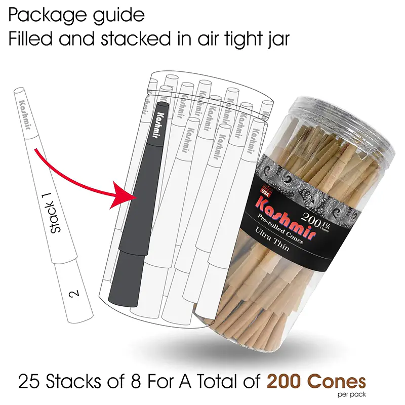 Kashmir Ultra Thin King Cones are the perfect solution for those seeking a high-quality smoking experience with a natural touch. Each pack of Kashmir Pre-Rolled Ultra Thin King Cones 200CT  includes 200 pre-rolled cones, made from organic hemp papers that are unbleached, chlorine-free, and GMO-free. The organic hemp papers used to make these king cones are said to offer a smoother and more natural taste than traditional papers. One of the main benefits of using pre-rolled cones is that they offer a simple and convenient way to enjoy your smoking experience without having to worry about rolling your own joints. The Kashmir Ultra Thin King Cones have a pre-rolled design which makes them incredibly easy to use; all you need to do is fill them with your chosen smoking product, twist the end to keep it in place, light it up, and enjoy.