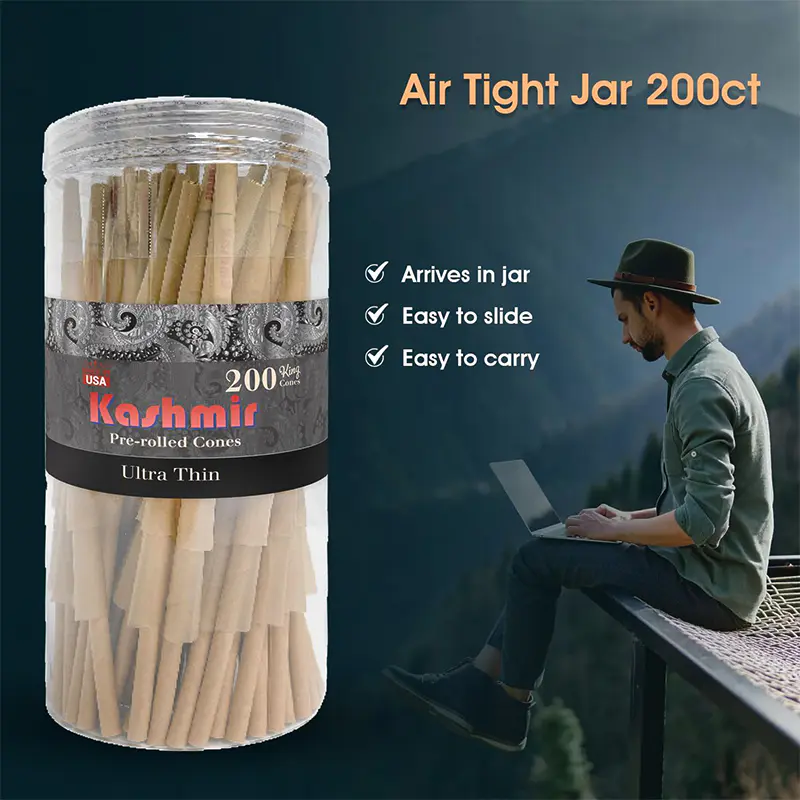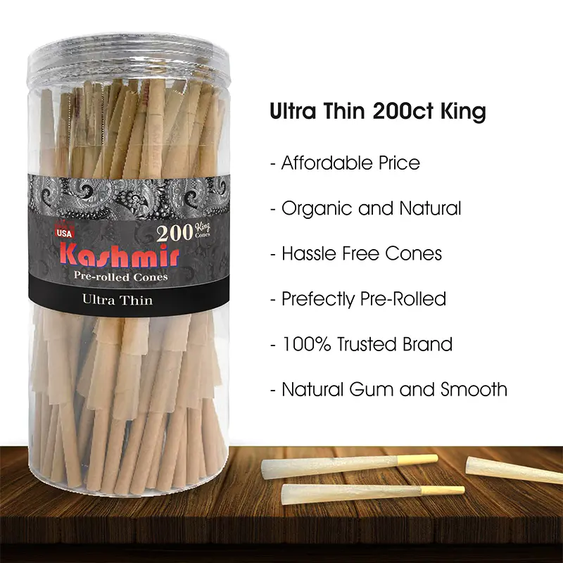The Kashmir Pre-Rolled Ultra Thin King Cones 200CT  also come with paper filters that make them even more enjoyable to use. The filters help to reduce tar and other harmful substances when you inhale, ensuring a smoother and less harsh smoking experience. The filters also help to keep your smoking product from getting in your mouth while you enjoy it, making it a more enjoyable and cleaner experience overall. One thing that sets Kashmir420 Ultra Thin King Cones  apart from other pre-rolled cones on the market is their size. These king cones are much larger than standard pre-rolled cones, which means you can put more smoking product in them and enjoy a longer and more satisfying smoking experience. This makes them ideal for sharing with friends or for those who prefer a larger roll.