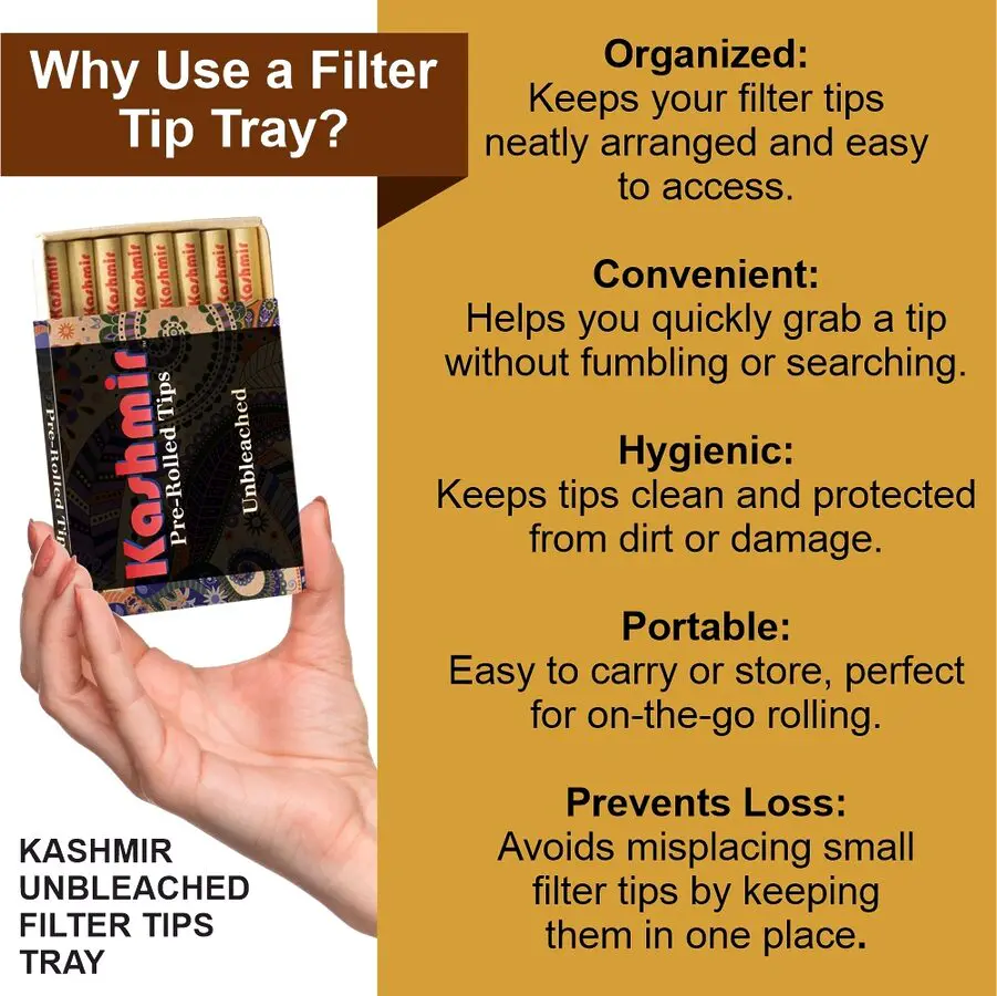 Buy Kashmir’s Unbleached Pre Rolled Filter Tips Tray—built for smoother, cleaner sessions. These pre rolled filter tips are made from unrefined, natural paper and processed without chlorine, so flavor stays true while edges hold firm from spark to finish. Each tip measures 18 mm long by 6 mm wide for a consistent draw and comfortable pinch. Prefer to stock up? Pair the tray with a matching Filter Tips Display Box for grab‑and‑go refills at home or behind the counter.
